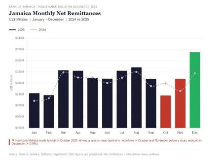Remittances to Jamaica rose 3.8 per cent in 2025, as a sharp post-hurricane rebound in the final two months of the year more than offset the slump that followed Hurricane Melissa’s October landfall.…